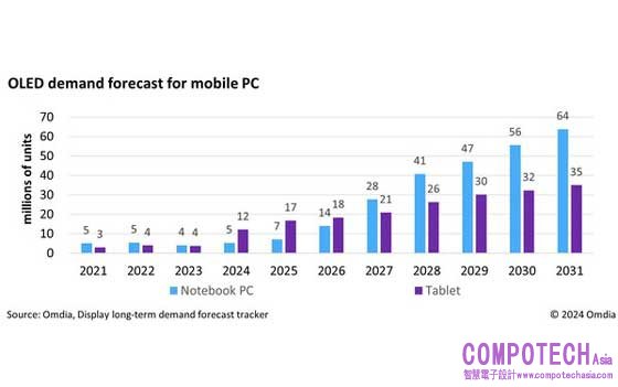 2024年5月24日--根據 Omdia 的顯示器長期需求預測追蹤的數據,行動電腦對 OLED 顯示器的需求,預計複合年度成長率 (CAGR) 從 2023 年到 2031 年將會增長 37%。這一急增反映了一個趨勢,即許多品牌越來越多地將 OLED 面板整合到其高級手提電腦及平板電腦中。