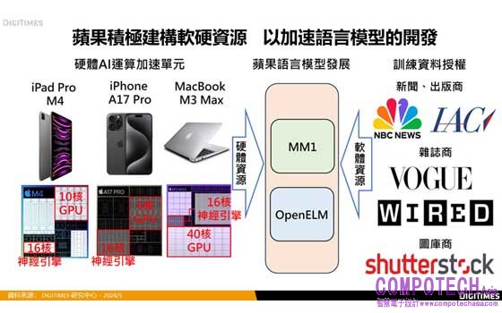iOS18 GenAI的關鍵技術為大語言模型(Large Language Model;LLM),蘋果積極投入LLM的開發,以建構完整軟硬體資源方式,加速LLM的開發時程,硬體方面增加GPU與神經網路運算引擎單元提升AI運算力,軟體針對LLM資料訓練部分,蘋果積極與新聞/出版商、雜誌、圖庫等業者,以授權方式擴大訓練資料領域範圍。