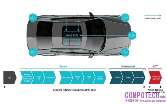 汽車系統設計人員因應 ADAS 功能實作的方式之一,就是重新考量電氣與電子系統架構的架構與整合。目前一般採用的架構為邊緣架構,由高度智慧化的雷達感測器組成,其會透過控制器區域網路或 100 Mb 乙太網路介面,將經過處理的數據串流至 ADAS 電子控制單元 (ECU)。這些感測器旨在實現高效能,其中包含處理器與通常為專用的加速器,藉此執行範圍、都卜勒和角度快速傅立葉轉換 (FFT),以及用於物件偵測、分類與追蹤的後續高階演算法。隨後,每個邊緣雷達感測器的最終物件數據均會傳送至 ADAS ECU。圖 1 以圖示說明邊緣架構。