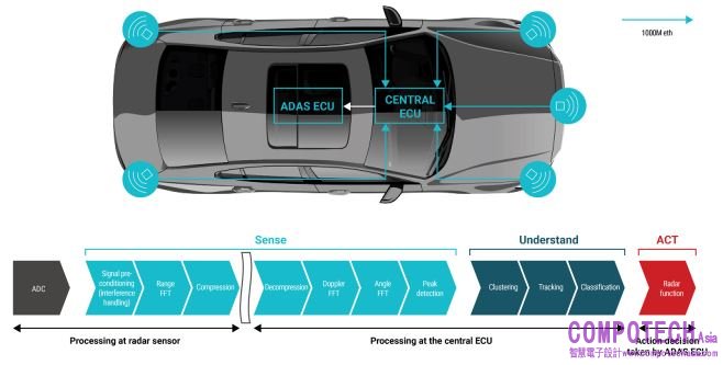 邊緣架構不斷進化,並逐漸受到衛星架構取代,在衛星架構中,遍佈在車輛周圍的感測頭會透過高速 1 Gb 乙太網路介面,將經過預先處理的範圍 FFT 數據傳送至強大的中央 ECU。大部分的數據處理作業都會卸載至中央 ECU (圖 2)。衛星架構可在中央處理器使用經過最少處理的數據,進行集中式數據處理,這不同於邊緣架構,因為邊緣架構則是由個別雷達感測器獨立處理所有數據。