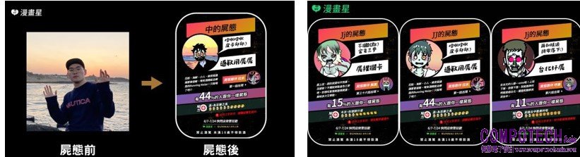 橘子集團旗下漫畫星更重磅推出「這裡拍拍~屍麥唷:)」人臉AI分析,應用「擴增、物件偵測技術」保留作者筆下的喪屍風格,如紅眼、尖牙等,並結合「漏斗型提示技術」擷取粉絲照片的外貌特徵,透過AI分析結果呈現擬真的屍態效果,就能立即獲取你的喪屍分身。即日起至活動網站上傳照片,就能變身黃色書刊筆下的喪屍樣貌,還能找出最近生活中導致你發狂失態的原因,完成分析即可獲得SUNMAI啤酒免費兌換券,邀粉絲一起屍態狂歡!