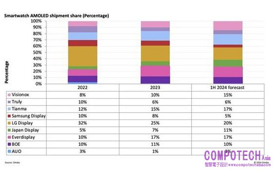 LG Display 和 Japan Display 為 Apple Watch 提供具有 LTPO 背板的高端柔性 OLED 面板,Samsung Display 則為 Samsung Galaxy Watch 提供 OLED。然而,得益於 Fitbit、Garmin、BBK、Honor、OPPO、Xiaomi 和 Google 等智能手錶裝置品牌的成功上量 (design win),EverDisplay、Tianma、Visionox、BOE 和 Truly 等中國 OLED 製造商正在擴大其 OLED 面板出貨量。與此同時,非品牌製造的智能手錶亦愈來愈多地應用到 OLED 面板。