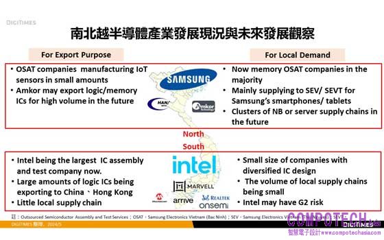 DIGITIMES 分析師周延觀察,越南半導體產業現況仍以聚集於河內市(Hanoi City)、胡志明市(Ho Chi Minh City;HCMC)兩大城市及其周遭,目前南、北聚集業者數量、業態上呈現不同格局。北部以記憶體封測組裝製造為主,以滿足當地消費性電子產品工廠製造內需的韓系供應鏈為主;南部則較多邏輯IC設計、封測業者,但IC設計業者規模較小,而封測製造業者呈「一大多小」格局,主要以出口導向為主。