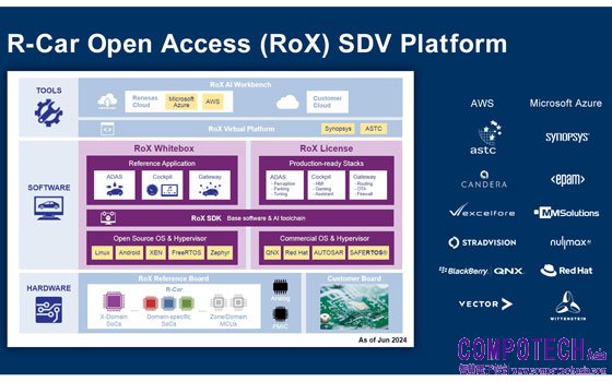RoX SDV平台有兩個版本。「RoX Whitebox」是一個開放、易於取得的軟體包,其中包括免版稅的作業系統和虛擬機器監視(Hypervisor)軟體,例如Android Automotive OS、FreeRTOS、Linux、Xen和Zephyr RTOS,以及為特定領域應用設計的參考應用程式。「RoX Licensed」是經過業界驗證的商業軟體解決方案,例如QNX和Red Hat車載操作系統,以及AUTOSAR相容的軟體和SAFERTOS®。經過預先整合和測試,可在瑞薩的R-Car SoC和MCU上運作,並包括來自STRADVISION經過預驗證的高級駕駛輔助系統(ADAS)軟體和用於車載資訊娛樂(IVI)的Candera CGI Studio等。這些軟體解決方案可以根據OEM的需求輕鬆產品化、客製化或擴展。