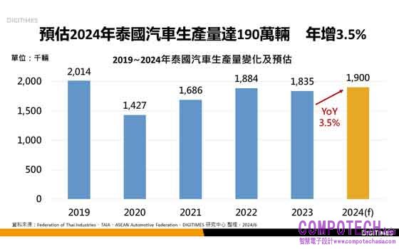 在東協十國中,包括泰國、印尼、馬來西亞、越南及菲律賓是主要汽車生產國,其中,泰國汽車產量領先各國,2023年達183.5萬輛。泰國官方預估泰國的汽車生產量在2024年將回升至190萬輛,年增3.5%。