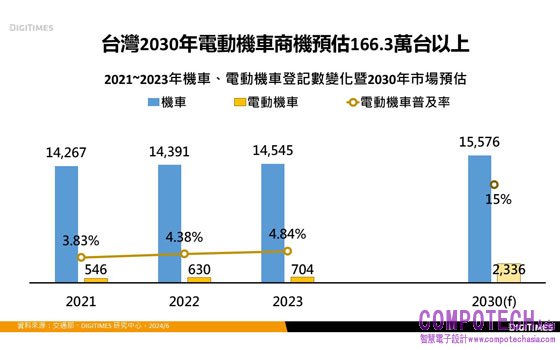 2024年7月22日--由交通部擬定的「運具電動化及無碳化」關鍵戰略行動計畫中,提出2030年台灣電動機車普及率達15%以上的目標,DIGITIMES研究中心觀察,2023年台灣電動機車普及率尚不及5%,欲實現2030年的普及率目標,尚需新售166萬台以上電動機車。