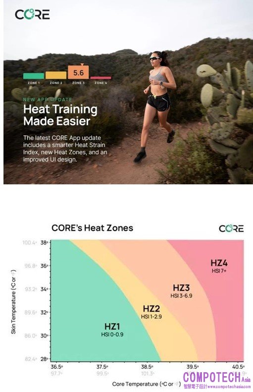 經過多年深入的實驗室測試,CORE的熱疲勞指數公式得到進一步優化,可以更準確地反映身體的熱疲勞情況,並為此引入更易於理解的熱區概念。這些熱區是利用艾邁斯歐司朗溫度感測器測量的溫度數據,由皮膚溫度和核心溫度之間的關係確定的。想要瞭解更多關於這一創新技術的細節,請參考CORE網站。
