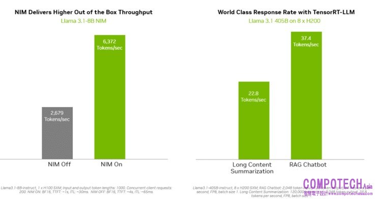 圖說:NVIDIA NIM 和 TensorRT-LLM 可大幅減少 Llama 3.1 模型的推理延遲並大幅提高吞吐量以更快產生詞元。
