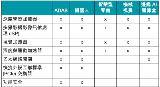 • ISP。整合式 ISP 核心可省去對外部 ISP 或 FPGA 設計的需求。機械視覺、智慧型購物車、機器人和 ADAS 等所有單一和多攝影機 AI 應用都可因此整合獲益。