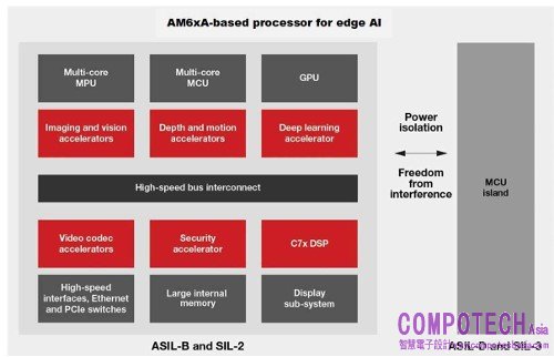 • 安全。整合式汽車安全完整性等級 (ASIL) D 與 SIL 3 相容安全微控制器 (MCU) 與 Cortex-R5 核心,可幫助在沒有外部安全 MCU 的情況下實現安全目標。此架構的其他處理作業也符合 ASIL B/SIL 2 規範,故可實現 ADAS、機器人、建築與農業電子控制單元應用。