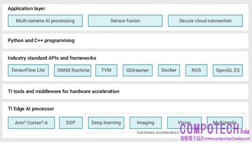 異構架構在應用程序中的應用不斷增加。TI 的視覺 AI 處理器具備加速深度學習、視覺與視訊處理,以及專用系統整合與進階元件整合,讓市售可用邊緣 AI 系統能針對性能、電源、尺寸、重量和系統成本進行最佳化。TI 的邊緣 AI 軟體開發環境以開放原始碼業界標準 API 為基礎,並具備硬體加速器的自動加速功能,以加快邊緣 AI 應用開發。