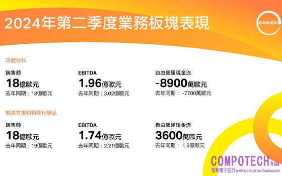 科思創財務長拜爾(Christian Baier) 表示:「第二季度,我們的銷售額保持穩定,EBITDA也達到了指引目標的中值。這是一個積極的消息,也證明了我們充滿韌性。鑒於持續充滿挑戰的經濟環境,我們相應地收減了全年的財務表現預期範圍。」