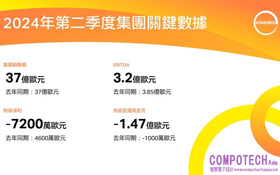2024年第二季度,在亞太和EMLA(歐洲、中東、非洲和除墨西哥以外的拉美)地區業務的帶動下,科思創的銷量較去年同期成長。但由於需求相關原因,銷售價格有所下降,集團銷售額因此保持穩定在37億歐元(去年同期:37億歐元)。集團息稅折舊攤銷前利潤(EBITDA)下降16.9%至3.2億歐元(去年同期:3.85億歐元),為之前預測的2.7億至3.7億歐元的中間值。原材料價格的下降,僅部分抵消了因需求因素造成的平均銷售價格下降帶來的影響。2024年第二季度,集團淨虧損7200萬歐元(去年同期:稅後淨利4600萬歐元),而自由營運現金流(FOCF)為–1.47億歐元(去年同期:–1000萬歐元)。