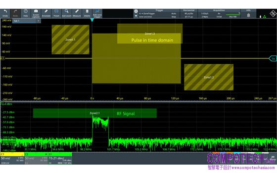 圖:使用觸發區在時域內觸發特定的RF線性調頻脈衝長度,並當線性調頻脈衝超出一定功率水準時在頻域內觸發。