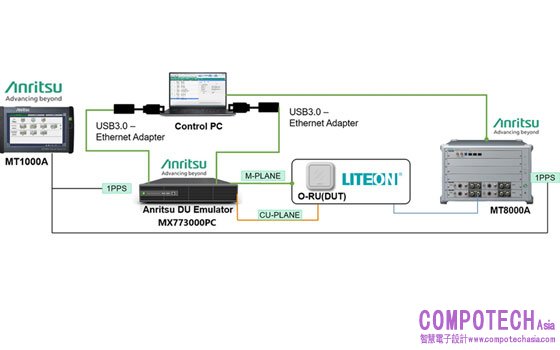 測試儀器:Anritsu 安立知提供了 O-DU (O-RAN分散式單元) 模擬器,用於與待測的 O-RU 進行通訊,並提供了廣受歡迎的傳輸測試儀 MT1000A、無線通訊綜合測試站 MT8000A,以及執行所需軟體的控制電腦。