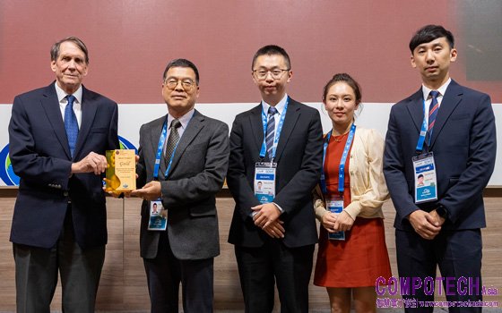 圖說:新動智能「電動車隊智能充電管理系統」拿下2024國際 APEC ESCI智慧運輸類金牌, APEC ESCI頒獎人(左一)致贈獎盃給中華臺北代表交通部運研所所長林繼國(左二)與新動智能總經理詹嘉文(右一)。