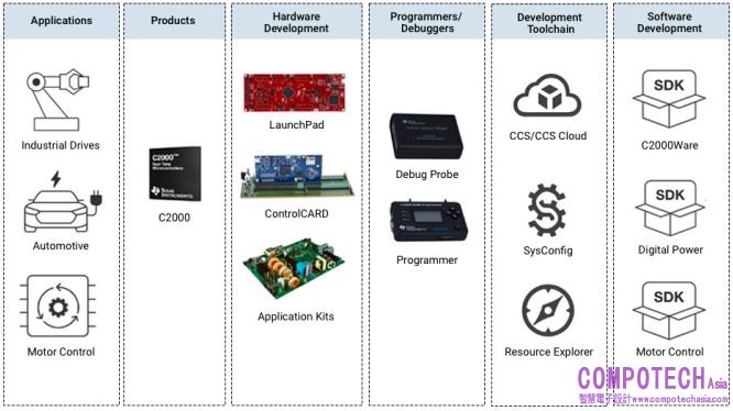 图2 顯示了 C2000 即時 MCU 的生態系統,其由多種應用、產品、硬體平台、開發工具及軟體開發套件組成。