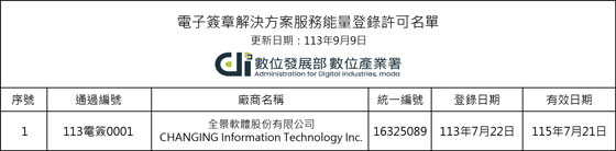 2024年09月10日--全景軟體通過數發部電子簽章解決方案服務能量登錄,符合電子簽章法 台灣電子簽章法修正案已於今年四月三讀通過,為健全台灣電子簽章技術服務業的發展環境,數位發展部推出「電子簽章解決方案服務能量登錄機制」,透過具公信力的登錄機制,建立國內的電子簽章產業地圖。全景軟體成功通過登錄,展現其電子簽章解決方案的合法性及合規性,作為一家資安公司,全景軟體不僅能保障簽署文件的安全性,還能提供多樣化的核身機制,確保簽署者身分,以及數位資料在傳輸及儲存過程中的安全。