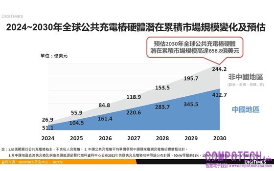 2024年9月23日--各國政府積極推動公共充電樁基礎建設,DIGITIMES分析師申作昊表示,2023年全球公共充電樁保有量約為402萬座,若以國際能源署預估2030年全球公共充電樁保有量1,530萬座規模為計算依據,則2024~2030年全球公共充電樁硬體潛在累積市場規模將達656.8億美元,為台系IPC業者重點競逐商機。