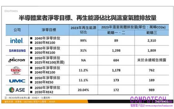 觀察全球六大半導體業者,分析師余佩儒認為,美商英特爾(Intel)的淨零策略最為積極,承諾在2040年實現溫室氣體淨零排放,而韓商三星電子(Samsung Electronics)、美商美光(Micron)、台系業者包括台積電、聯電和日月光則承諾於2050年實現淨零排放。值得關注的是,台積電於2023年9月將RE100的目標加速10年,從2050年提前至2040年實踐,但整體來看,台系半導體業者再生能源使用佔比低於國際大廠,例如英特爾2023年綠電佔比已高達99%,而2023年台積電再生能源佔比僅11.2%,2030年達到RE60仍有相當大的努力空間。