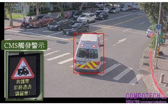 圖說:資策會「生命守護通道系統」,透過AI影像辨識技術,當輪椅和救護車通過路口時,路邊警示標誌提醒車輛留意弱勢行人與救護車通行。