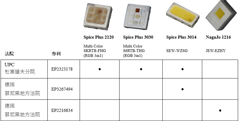 日亞主張 Spice Plus 系列的特定產品侵害 EP2323178 和 EP3267494專利。EP2323178 專利涉及 LED 封裝環氧樹脂,該環氧樹脂具有優異的耐熱性和耐光性。EP3267494 專利則是關於可在製造過程中達到高可靠性和高效率的 LED。這兩項專利代表了汽車照明和背光源市場的重要技術,該市場尤其需要高可靠性的 LED。