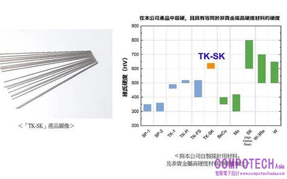 田中貴金屬工業製造並提供各種貴金屬探針用材料,將其運用在半導體前段製程和後段製程中實施檢測的設備。本次將要宣布的「TK-SK」,作為探針用的鈀合金材料,具備最大硬度640HV,因此主要設定其用途為測試插座,應用於後製程中通電試驗的最終測試。