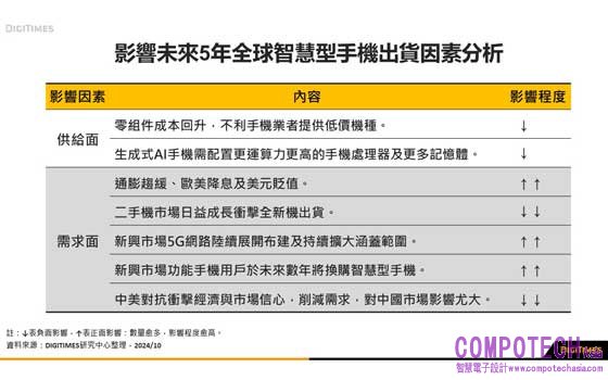 2024年10月21日--根據DIGITIMES最新研究,2024年全球智慧型手機出貨量預估為11.814億支,成長4.9%;展望未來5年,印度、東南亞、南美與非洲等地數量眾多的功能手機用戶將有換購智慧型手機的需求,而且這些地區的5G網路持續展開布建及擴大涵蓋範圍,可望進一步帶動這些市場智慧型手機的出貨規模成長,分析師林俊吉預估全球每年出貨成長率將落在3~4%,複合年均成長率(CAGR)將達3.6%。