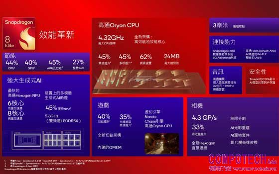 高通技術公司資深副總裁暨行動終端裝置事業部門總經理Chris Patrick表示:「我們非常高興能夠首次將高通Oryon的強大功能引進我們的Snapdragon行動平台。今年稍早時,我們首度在PC上推出此CPU,為PC使用者提供卓越的體驗和無與倫比的電池續航力,為整個產業注入活力,並獲得消費者的關注。今天,第二代高通Oryon CPU在我們的旗艦行動平台上首次登場,帶來重大的進展。我們期待消費者對高通的CPU技術帶來的全新體驗感到興奮。透過領先的CPU、GPU和NPU功能,Snapdragon 8 Elite實現突破的效能增強和功耗效率3。此外,透過直接在裝置上提供個人化、多模態的生成式AI,此行動平台革新行動體驗,實現對於語音訊息、情境和圖像的理解,全面強化從生產力到創造力的任務,同時將使用者隱私列為優先考量。」
