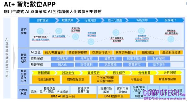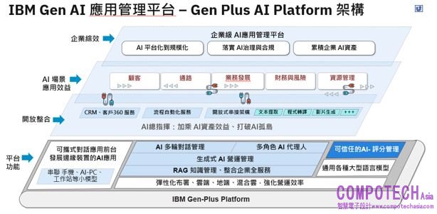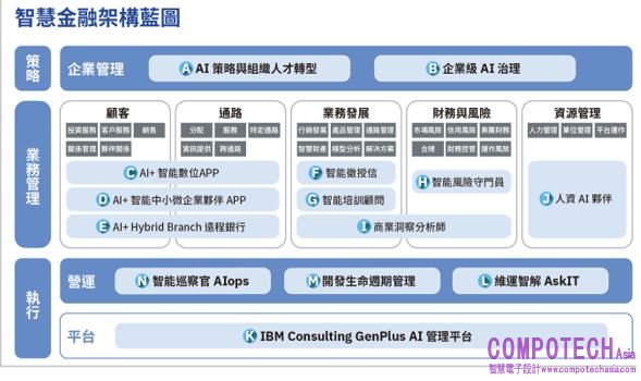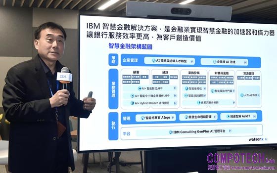 蕭俊傑表示,台灣 IBM自2013年起持續在銀行業推動行動銀行、雲端應用、核心系統轉型、數據驅動、體驗優先等科技的深度應用,與國內銀行業在數位轉型的旅程砥礪前行。2024年,IBM 諮詢顧問團隊根據銀行的業務板塊、借用Banking Industry Architecture Network (BIAN)框架,規劃了「智慧金融藍圖」,也就是參與式銀行的架構與樣貌。從最頂層的管理面,對整體的AI策略、組織與人才進行全盤檢視;同時,為兼顧符規與風險控管,需要同步開展完備且可落地的AI 治理。中層的業務面就是最受注目的 AI 應用場景,橫跨顧客、通路、業務發展、財務與風險、資源管理、營運、開發、維運等各面向,著重在AI技術如何擴大既有商業價值。IBM 還打造了 Gen Plus AI 應用管理平台,讓銀行可以敏捷複製範本,建立AI應用場景與AI助理,重複組裝運用AI資產,極大化AI 投資成本。最底層則推薦採用 watsonx 企業級人工智慧與數據平台,包括watsonx.ai 資料平台、watsonx.ai 模型開發平台、與watsonx.governance 擔任AI生命週期治理的關鍵角色。