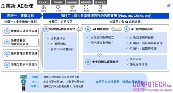 落實風險評估與分級機制,實施AI業務/流程、AI模型、隱私與安全管理,搭配自動化KPI監控體系管理。