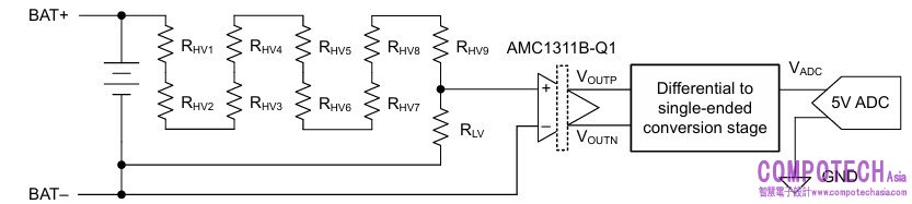 典型的 EV 電池電壓為 ≥400V,產業趨勢朝向 1kV 或更高電壓發展。更高電壓的電池有助於降低最大電流需求並顯著地提高效率。測量此電壓並將其傳輸至相關車輛系統時,需要使用類比轉數位轉換器 (ADC) 進行訊號轉換,該轉換器通常由大約 5V 的電壓供電。ADC 無法接受大於該電壓的輸入訊號。