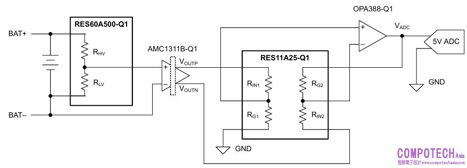 图 3. 採用 RES60A-Q1、RES11A-Q1 和 AMC1311B-Q1 的電池電壓測量電路