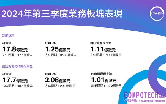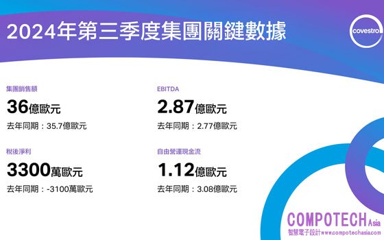 2024年第三季度,科思創的銷量持續成長,尤其是EMLA(歐洲、中東、非洲和除墨西哥以外的拉美)和亞太地區。集團銷售額約36億歐元,與去年同期的35.7 億歐元相比保持穩定,原因是較低的原材料價格導致了銷售價格水準的下降。與2023年第三季度相比,集團稅息折舊前攤銷前利潤(EBITDA)成長了3.6%,達到2.87億歐元(去年同期:2.77億歐元),處於2.5億歐元至3.5億歐元的預測範圍內。集團稅後淨利為3300萬歐元(去年同期:–3100萬歐元)。自由營運現金流減少至1.12億歐元(去年同期:3.08億歐元),主要是營運現金流下降所致。