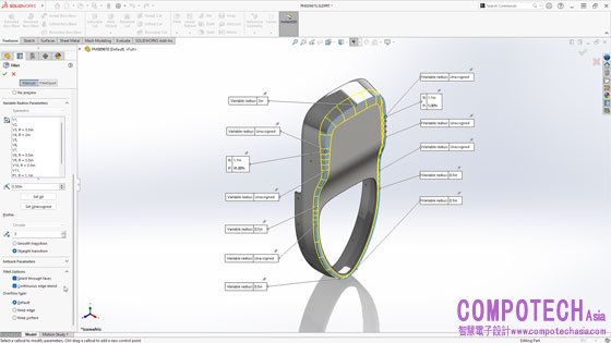 • 運用新增的倒角選擇加速器(Accelerator for Chamfer)簡化零件設計,並能夠透過連續混合圓角邊緣的選項,創建更平滑的可變尺寸圓角。