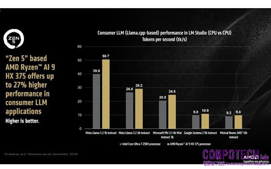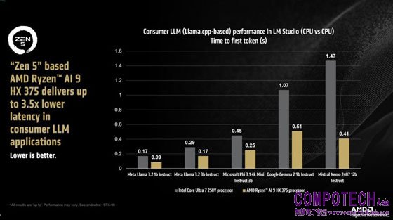 註2:STX-98:截至2024年10月由AMD進行的測試。對於樣本提示「用五行解釋熵的概念」進行3次執行的平均效能。所有測試均在LM Studio 0.3.4上進行。測試的模型包括:Meta Llama 3.2 1b Instruct、Meta Llama 3.2 3b Instruct、Microsoft Phi 3.1 4k Mini Instruct、Google Gemma 2 9b Instruct、Mistral Nemo 2407 13b Instruct。(所有模型均為Q4 K M量化)。Intel的特定配置:8個CPU執行緒。AMD的特定配置:12個執行緒。(Llama.cpp建議將執行緒設置為物理核心的數量)。搭載AMD Ryzen AI 9 HX 375的HP OmniBook Ultra筆電,32GB 7500 MT/s RAM,開啟VBS,Windows 11 Pro 24H2。搭載Intel Core Ultra 7 258V的ASUS Zenbook S14 UX5406SA 14吋筆電腦,32GB 8533 MT/s RAM,啟用VBS,Windows 11 Pro 24H2。效能可能會改變。