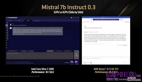 在我們的對比測試中,Intel筆電的RAM實際上速度較快,達到8533 MT/s,而AMD筆電的RAM為7500 MT/s。儘管如此,AMD Ryzen™ AI 9 HX 375處理器的每秒token生成速度(tokens per second)比競爭對手快出高達27%。參考資料顯示tokens per second (tk/s)是測量LLM輸出token速度的指標,大約對應於每秒在螢幕上顯示的字數。