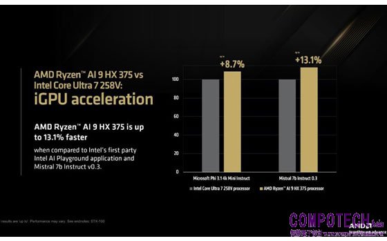 我們使用Intel AI Playground提供的模型,即Mistral 7b Instruct v0.3和Microsoft Phi 3.1 Mini Instruct。在LM Studio中使用可比較的量化後,我們發現AMD Ryzen™ AI 9 HX 375在Phi 3.1的速度比競爭對手快8.7%,在Mistral 7b Instruct 0.3的速度則快13%。