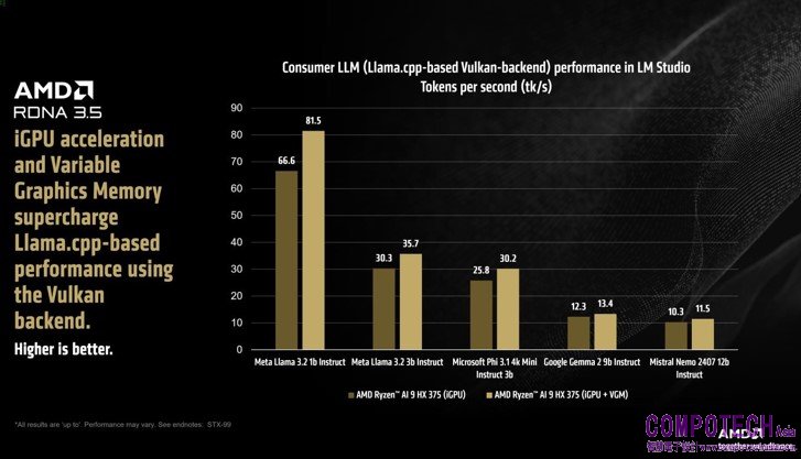 註3:STX-99:截至2024年10月由AMD進行的測試。對於樣本提示「用五行解釋熵的概念」進行3次執行的平均效能。所有測試均在LM Studio 0.3.4上進行。測試的模型包括:Meta Llama 3.2 1b Instruct、Meta Llama 3.2 3b Instruct、Microsoft Phi 3.1 4k Mini Instruct、Google Gemma 2 9b Instruct、Mistral Nemo 2407 13b Instruct。(所有模型均為Q4 K M量化)。12個CPU執行緒。(Llama.cpp建議將執行緒設置為物理核心的數量)。GPU offload = MAX。VGM在VGM執行期間設置為16GB。搭載AMD Ryzen AI 9 HX 375的HP OmniBook Ultra筆電,32GB 7500 MT/s RAM,啟用VBS,Windows 11 Pro 24H2。效能可能會改變。