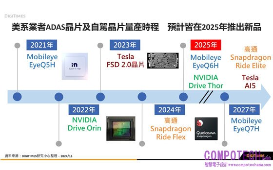DIGITIMES分析師余君濤表示,美系自駕晶片業者包括Mobileye (於2017年被英特爾收購)、高通(Qualcomm)、NVIDIA與Tesla等,這些業者憑藉先進技術與成熟的產業鏈,在全球先進駕駛輔助系統(Advanced Driver Assistance Systems;ADAS)晶片與自駕晶片市場佔據重要地位。各大業者相繼推出高運算力的自駕晶片已成為推動自駕技術升級的關鍵要素,將強化AI功能,協助自駕車輛進行即時路徑規劃及預測道路使用者行為,進一步提升行車安全性。