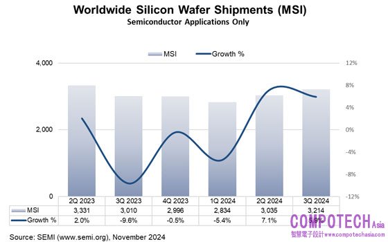 2024年11月13日--SEMI國際半導體產業協會旗下矽產品製造商組織(Silicon Manufacturers Group, SMG)發佈最新晶圓產業分析季度報告指出,2024年第三季全球矽晶圓出貨量較上一季上升5.9%,來到3,214百萬平方英吋(million square inch, MSI),和去年同期3,010百萬平方英吋相比,則是同比成長6.8%。