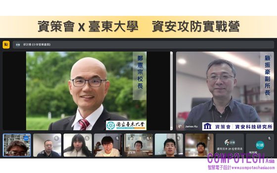 圖說:「資安攻防實戰營」首日採遠距理論授課模式,臺東大學鄭憲宗校長與資策會資安所顧振豪副所長及全體學生進行線上合影。
