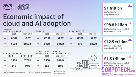 未來六年,使用雲端運算和AI預計為全球帶來更加可觀的經濟效益。到2030年,上雲預計將為美國和加拿大創造逾5.6兆美元GDP,其中8,420億美元將來自在雲端使用AI。在歐洲國家,這兩項資料約為2.7兆美元和4,340億美元。在亞太地區,上雲有望產生逾2.7兆美元GDP,其中在雲端使用AI將貢獻逾2,020億美元。
