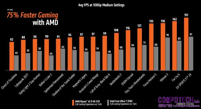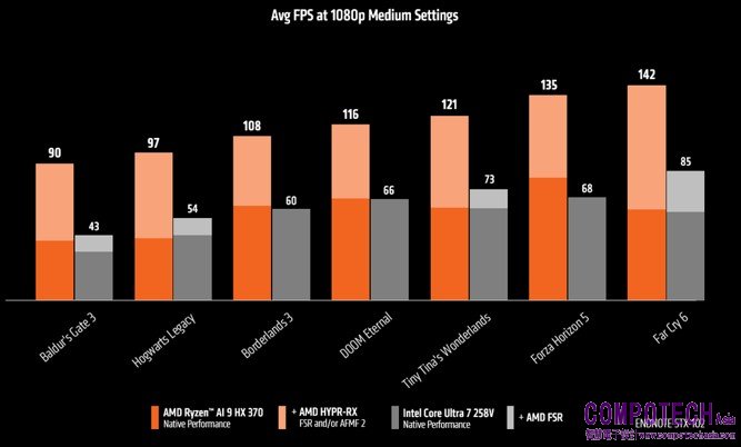 與Intel Core Ultra 7 258V相比,AMD Ryzen™ AI 9 HX 370處理器在1080p解析度及雙方均啟用效能提升技術運行熱門遊戲時,能夠帶來75%的平均效能提升註1。