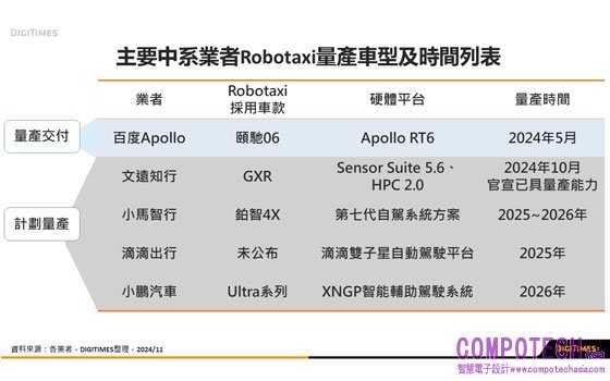 DIGITIMES分析師江明謙觀察,中系Robotaxi主要業者如百度、文遠知行、小馬智行、滴滴出行、小鵬汽車等,在歷經反覆的系統測試,直至獲得監管單位批准可收費營運後,即陸續發布新一代Robotaxi量產車,期透過量產製造降低生產成本,實現更大規模部署並創造獲益。
