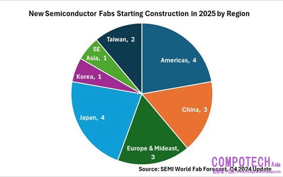 圖說:根據 SEMI 預測,2025 年北美和日本各有 4 座新廠計畫領先其他地區;