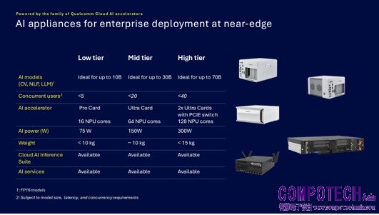 2025年1月6日--高通技術公司今日於CES 2025宣布推出高通AI本地裝置解決方案(Qualcomm AI On-Prem Appliance Solution),為本地桌上型或壁掛式硬體解決方案,以及高通AI推論套組(Qualcomm AI Inference Suite),為一整套用於AI推論的軟體與服務,範圍涵蓋近邊(near-edge)至雲端。全新產品組合使中小企業、大型企業與產業組織得以在本地運行客製與現有的AI應用,包括生成式工作負載。相較於承租第三方AI基礎架構的成本,於本地運行AI推論可大幅節省營運成本和總體擁有成本(TCO)。