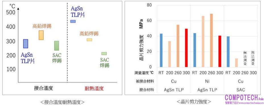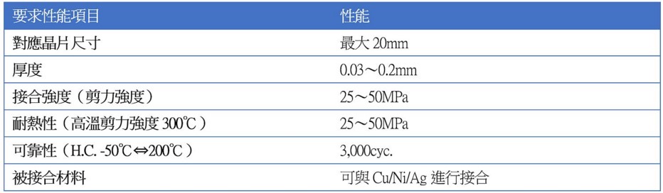 由於高溫會引起故障和使用壽命縮短的影響,因此包括功率半導體在內的半導體元件需具有高溫耐熱性。此外,在功率半導體封裝製造方面,目前主要的使用接合材料普遍是會對環境造成負荷而正逐漸被其他材料取代的(※2)高鉛焊錫、耐熱性較低的SAC焊錫(※3)以及銀(Ag)燒結材等材料。本產品可在250℃的加熱溫度下進行液相擴散接合(※4)。接合後,耐熱溫度可高達480℃,比現有材料更具有高耐熱性。此外,在接合強度方面,由於最大會維持在50MPa,因此可以對應各種被接合材料。另外,本產品為無鉛的接合零件,在接合上通過3,000次熱循環測試的高可靠性也為其一項特色。