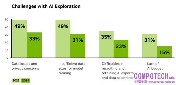 與早期探索 AI 相關的挑戰同樣在減少。調查顯示,回答有資料問題和隱私疑慮的公司數量減少,對於模型訓練資料不足的疑慮也降低。這些改善反映出業界的專業知識與資料管理實務正在不斷增加。