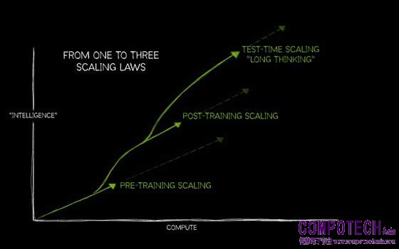 然而,AI 發展至今,需要三個不同的定律來描述不同方式利用運算資源如何影響模型效能。這些 AI 擴展定律合在一起,包含預訓練擴展(pretraining scaling)、訓練後擴展(post-training scaling),以及又稱為長思考(long thinking)的測試階段擴展(test-time scaling),反映出 AI 領域如何在各種日益複雜的 AI 用例中運用額外的運算技術演進發展。